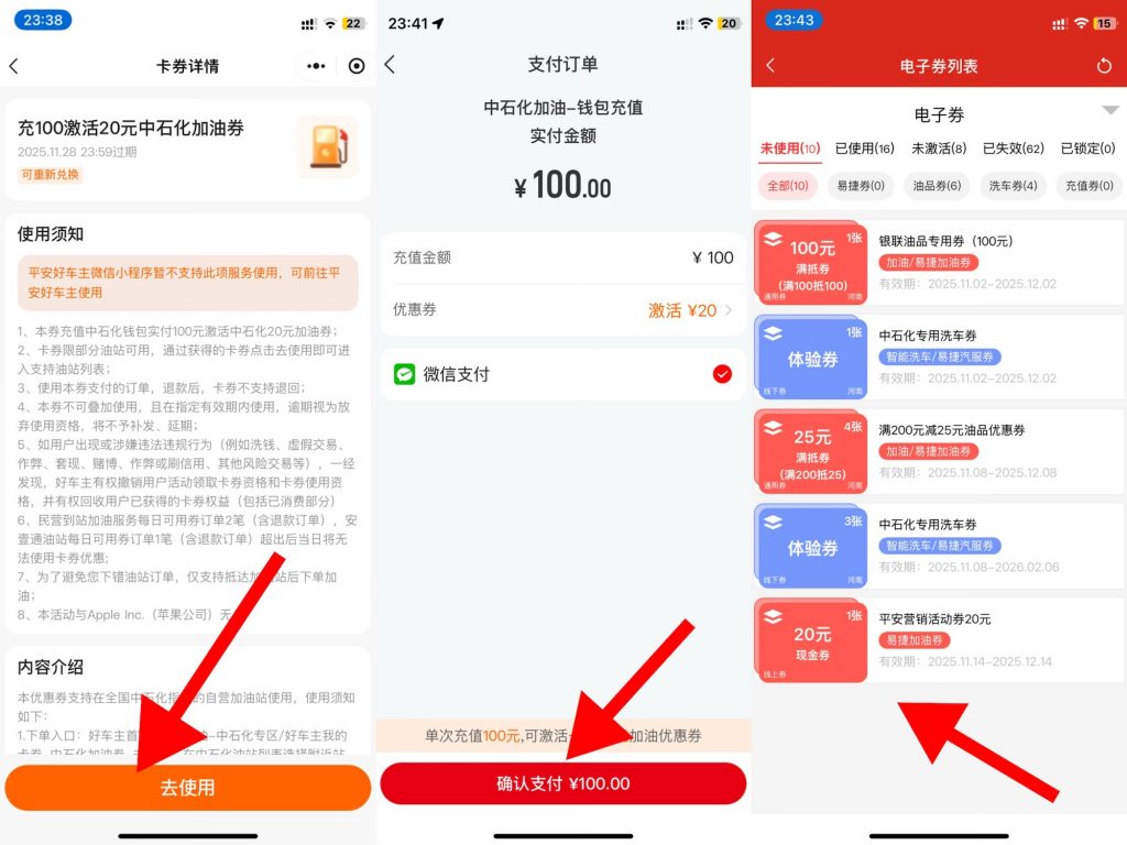 另外两张中石化专用:满10.01-10,和20-10,在建行生活优惠券里点去使用充中石化(专用券必须分别点“去使用”才可以)