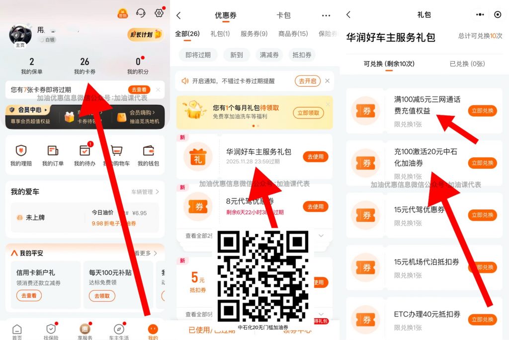 然后下载“平安好车主”,我的-卡券里,找到“华润好车主服务礼包”,点进去找到“充100激活20元中石化加油券”,点击兑换(还有100-5话费券也可以兑换)