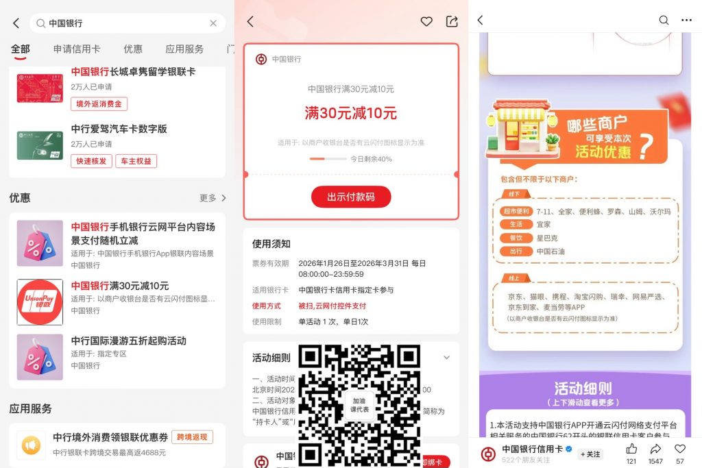1,活动详情:中国银行62开头银联信用卡,云网活动30-10,操作跟以前的云网活动一样,云闪付搜中国银行,查看每日名额余量,