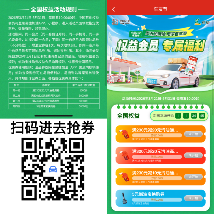 以下站点可到站,找加油员扫码领易捷加油券,面额200-10,在哪个站领的只能在哪用,每月4次,有效期一天,