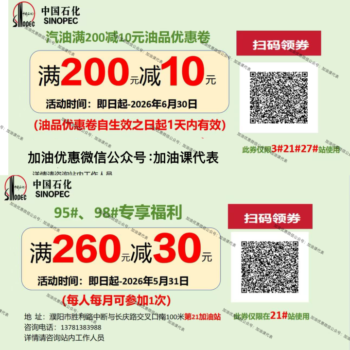 3,中石化平东加油站,建设路开发一路西丰麟花园西侧,每天,E92持卡或者石化钱包加油,满150优惠0.4元/升,260以上优惠0.6元/升